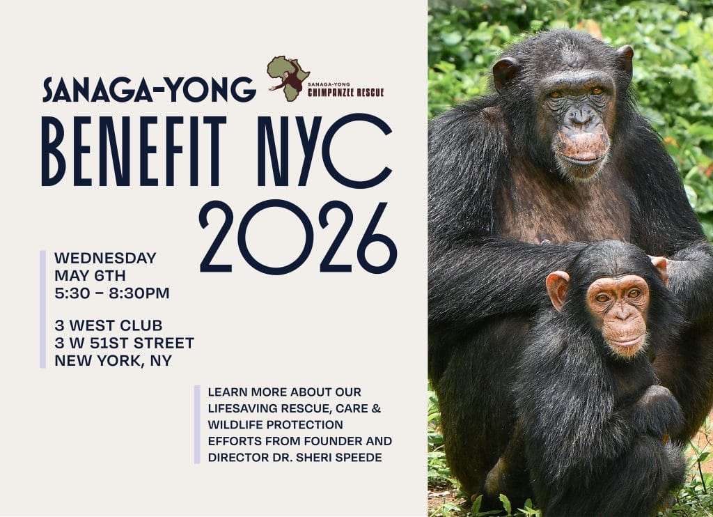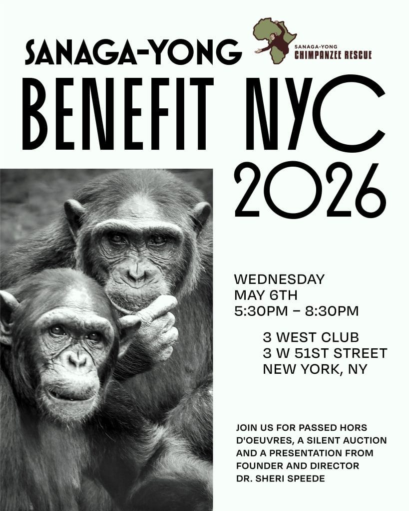 Wednesday, May 6th, New York City ~ Join us at the historic 3 West Club, known for its “Old New York” sophistication and stunning views, from 5:30pm to 8:30pm to “meet” the chimpanzees of Sanaga-Yong and learn about our critical wildlife protection efforts from Founder and Director, Dr. Sheri Speede.
